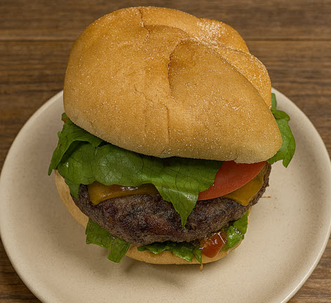 1/2 pound of ground brisket beef with homemade mayo and homemade BBQ sauce with lettuce, pickles, onions, tomatoes, cheese on a toasted bun!